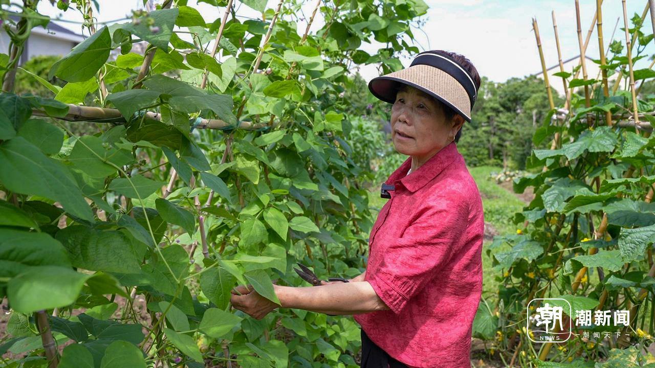 小白村居民张美娣在菜园摘菜。邱建平 摄